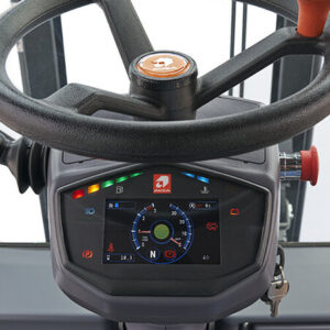 Accede a toda la información a tiempo real desde la pantalla digital situada junto al volante: velocidad, temperatura, alarmas, sensores… Con el joystick de la cabina podrás interactuar con ella y realizar un autodiagnóstico de la máquina.