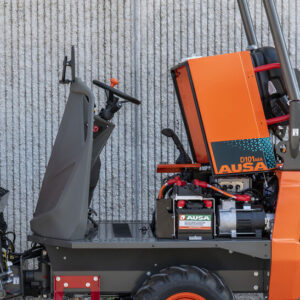 El D101AEA Compact es el dumper eléctrico más compacto de AUSA. Tiene una capacidad de carga de 1.000 kg y una tolva con descarga en altura, capaz de elevarse y descargar desde una altura de hasta 1,6 metros.