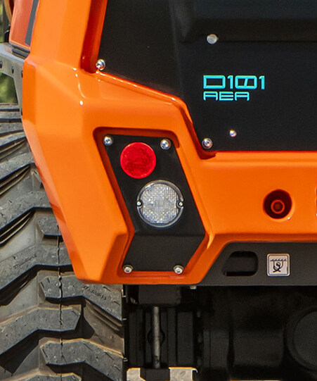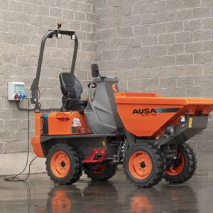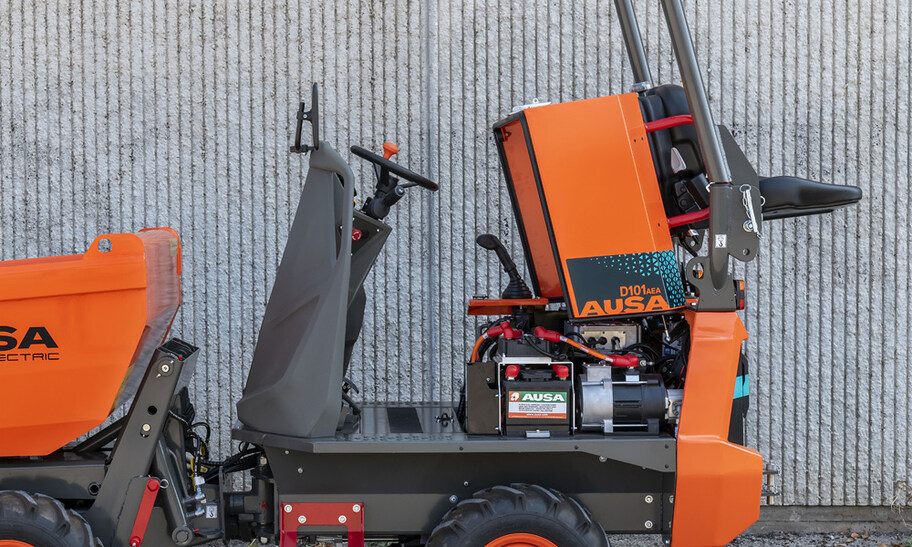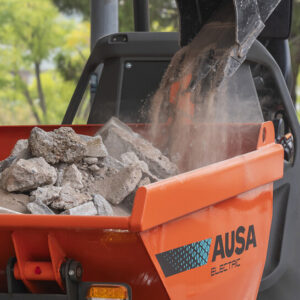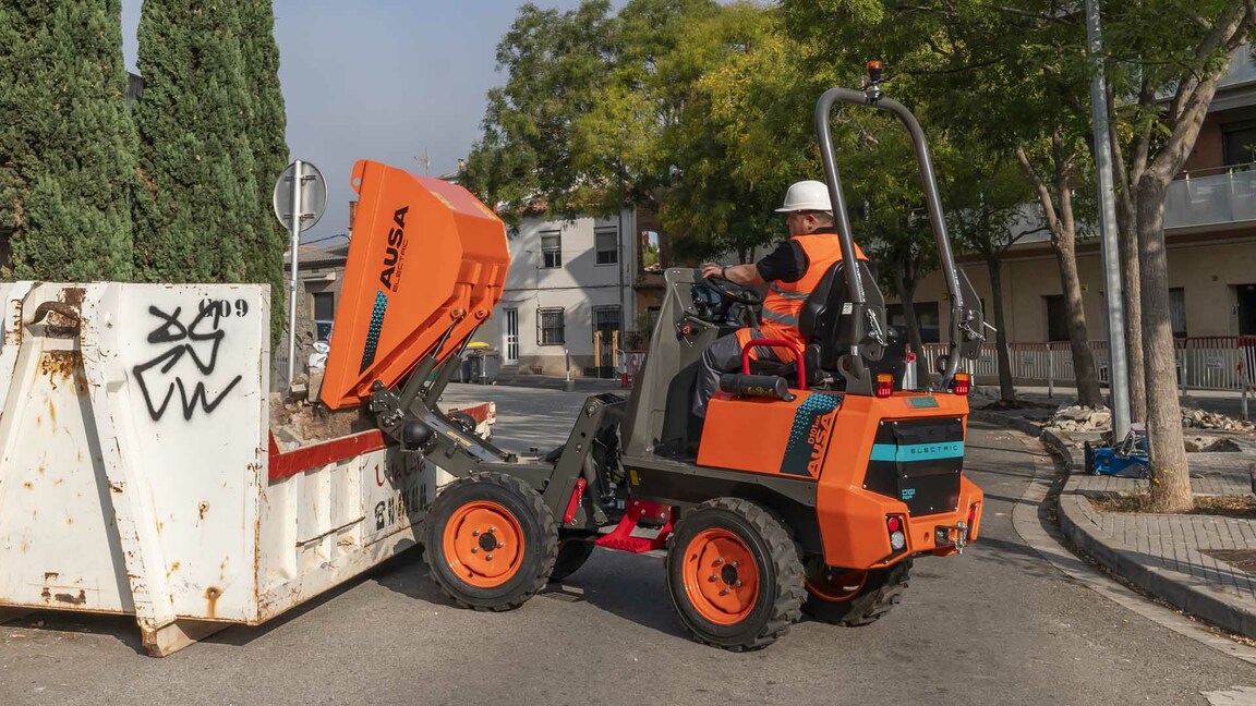 El dumper eléctrico D101AEA tiene una capacidad de carga de 1.000 kg y una tolva con descarga en altura, capaz de elevarse y descargar desde una altura de hasta 1,6 metros.