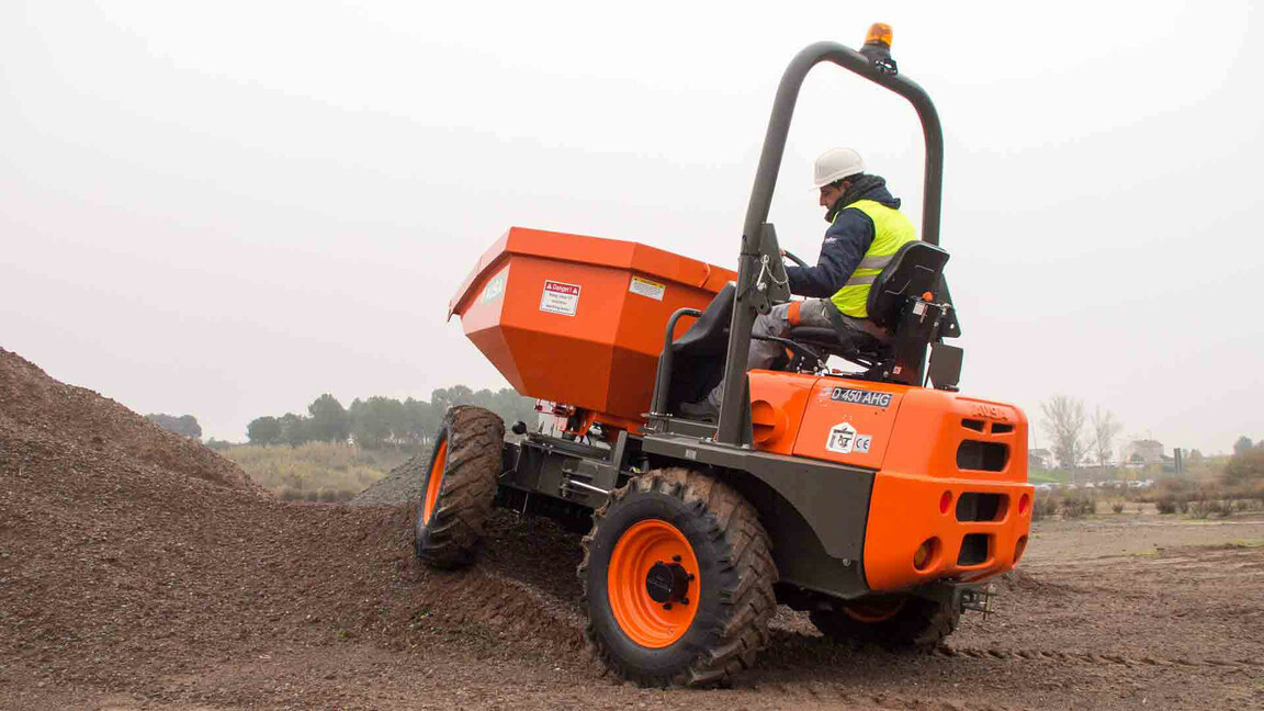 Polivalente, rentable y ágil. El D450AHG, con su capacidad de carga de 4,5 toneladas y tolva giratoria de 180 grados es el dumper con la mejor relación capacidad/precio del mercado.