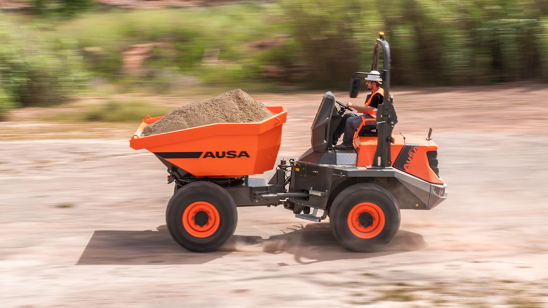El dumper D601AHG+ es una de las principales soluciones de AUSA para las tareas de movimiento de tierras de media y gran envergadura. Con 6 toneladas de capacidad de carga y una tolva con descarga giratoria, destaca por su gran capacidad todoterreno y seguridad.